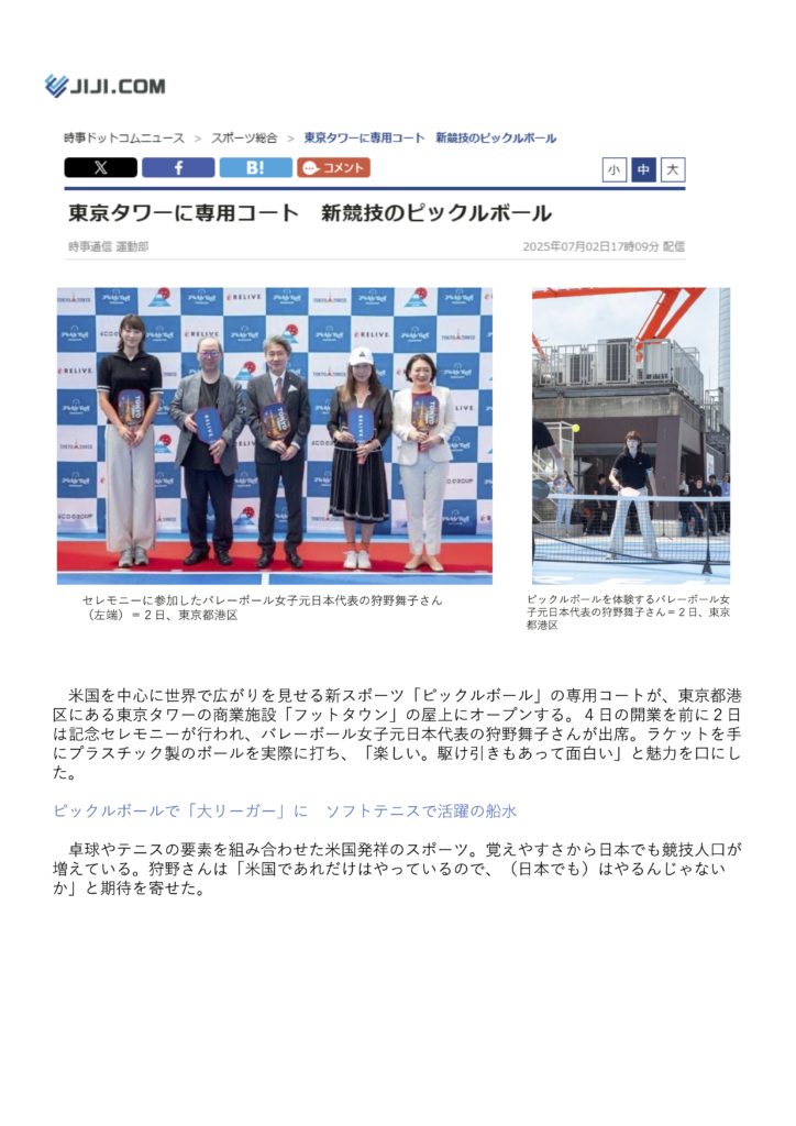 東京タワーピックルボールフレンドシップの記者会見の模様が、時事ドットコムニュースにて掲載されました。
